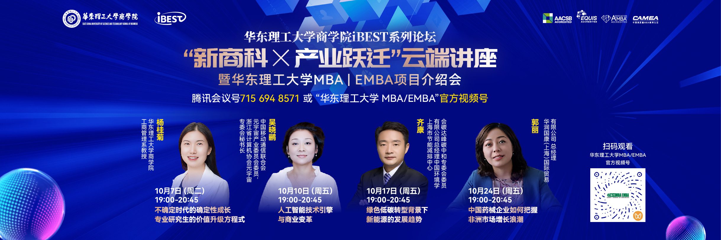 [09-10]>【特邀关注】华东理工大学商学院iBEST系列论坛 “新商科×产业跃迁”云端讲座暨华东理工大学MBA/EMBA项目介绍会