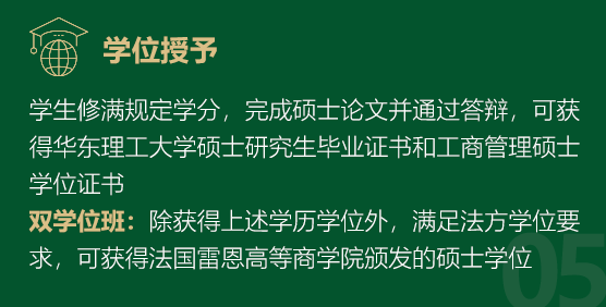 华东理工大学的MBA项目为学生提供了专业核心课、公共课、中文班的多个选修模块,以及针对特定产业的生物医药专业班、大健康产业管理班和具备专业偏重的国际合作的特别班型。学生需要完成45个学分,通过毕业论文和答辩,以获得工商管理硕士学位和研究生毕业证书。对于双学位班级,学生还需满足法方学位要求,以获得法方学校颁发的硕士学位证书。